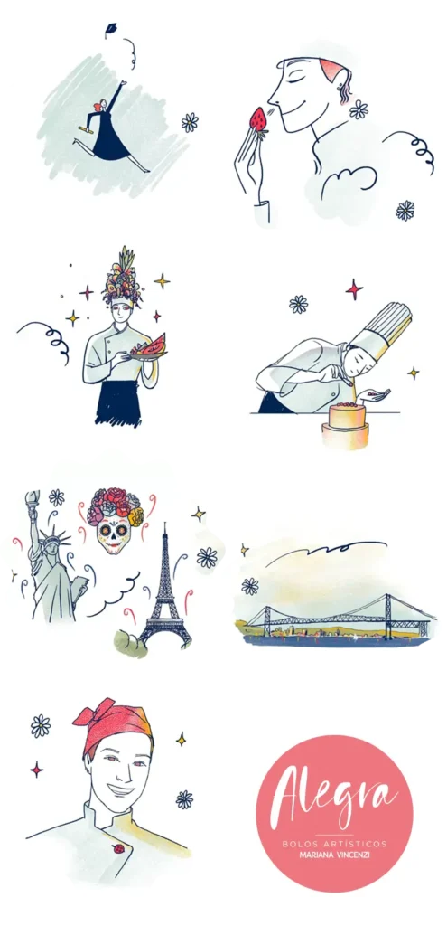Referências e inspirações são bem-vindas e nos ajudam a compreender preferências, estética e proposta. A partir disso, criamos o bolo respeitando a vontade do cliente, com o cuidado, a leitura e o traço da Alegra.
